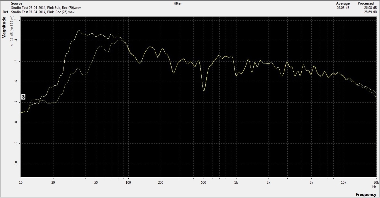 Top line is the "Pink Noise" source file, the bottom line is the ARCless recording with the Sub ON.